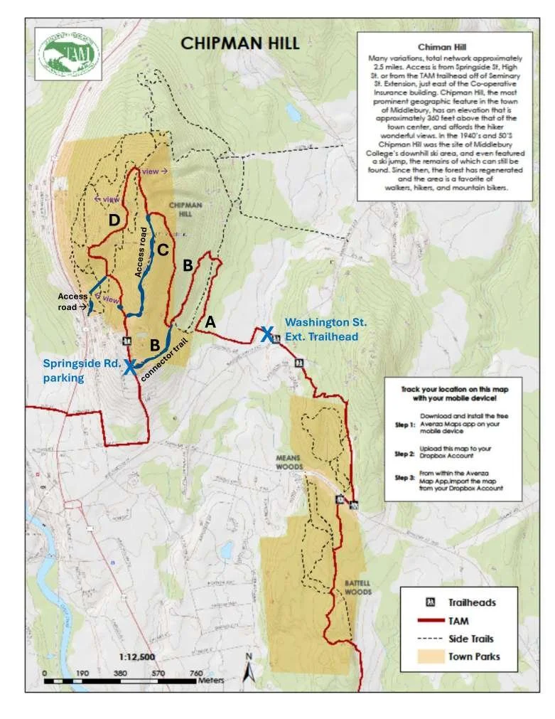 From the Middlebury Town Forest Recreation Plan: Chipman Hill is a 132-acre forest block … within a mile of the village green. With its steep slopes, it was once the college ski hill. Today it is a dense forest home to roughly five miles of trails. It has multiple scenic vistas that are popular for picnics. Hikers and mountain bikers heavily use the trails, including building and maintaining trails.